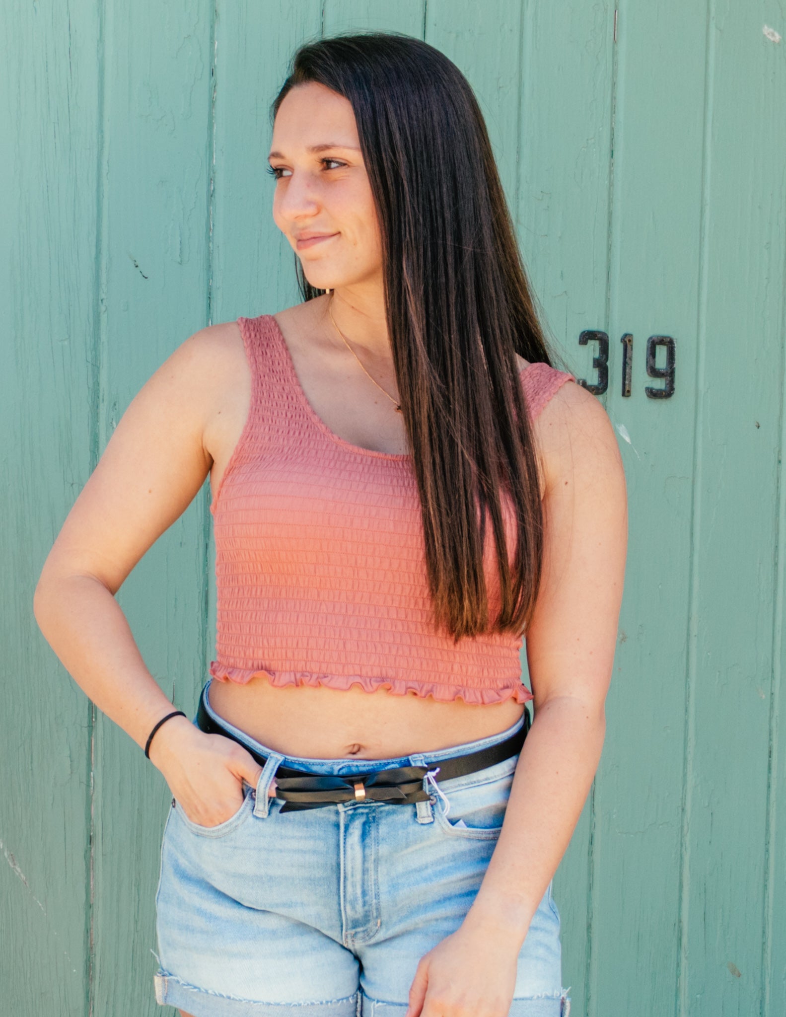 - long black belt with bow tie on top of buckle