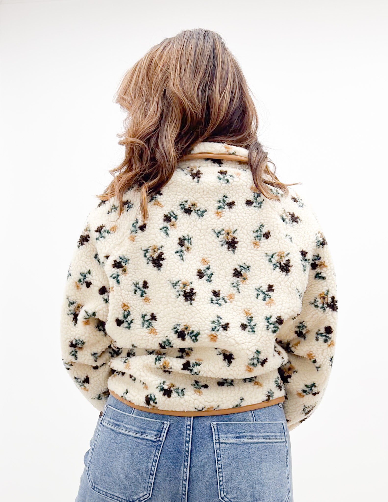 jacket. Featuring a soft, plush texture and a vibrant floral design,