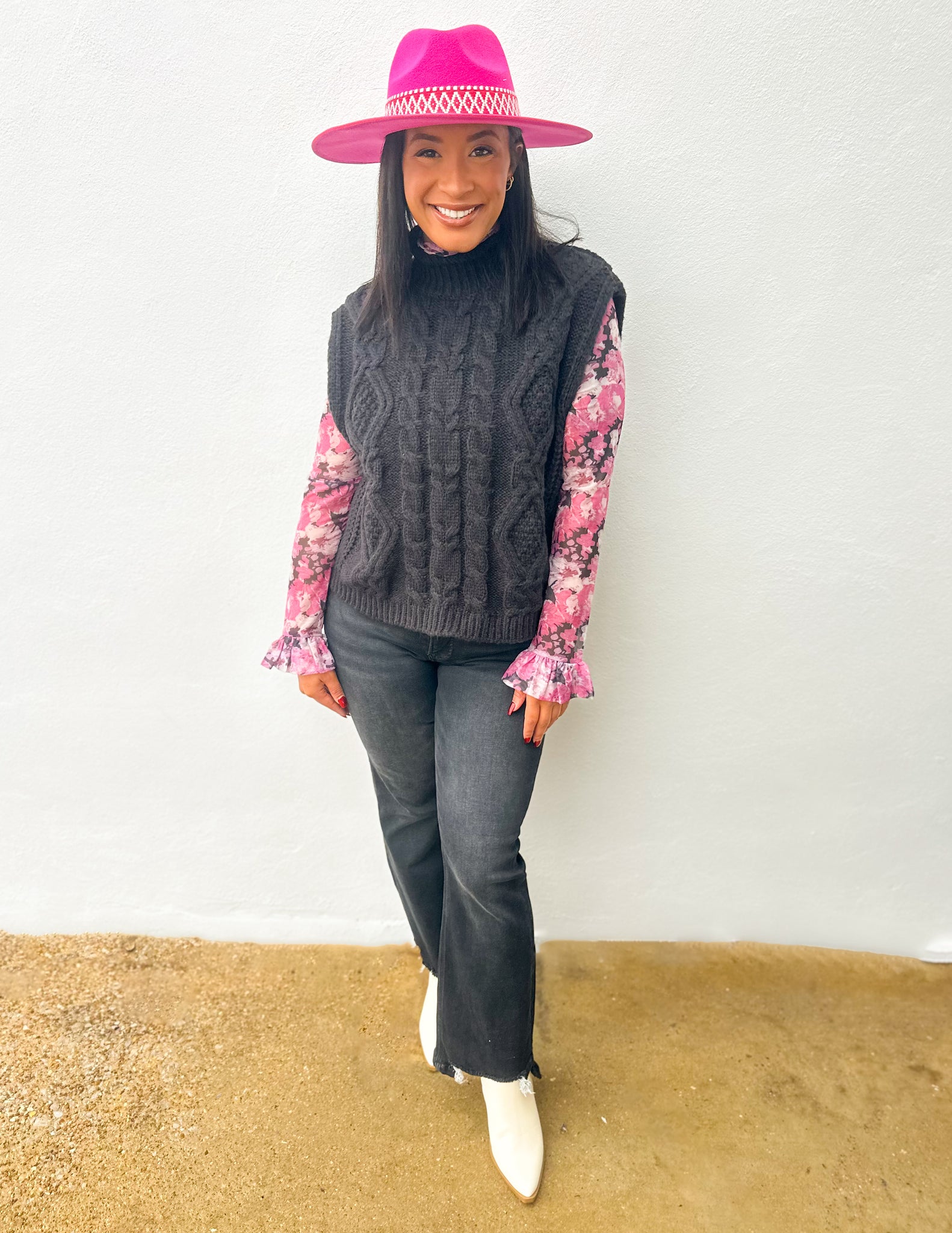 + Sheer floral mock neck top + Sheer floral mesh fabrication + Mock neckline + Long sleeves with ruffled cuffs + Fitted bodice + Model is 5' 10.5" 32-24-36 and wears a S