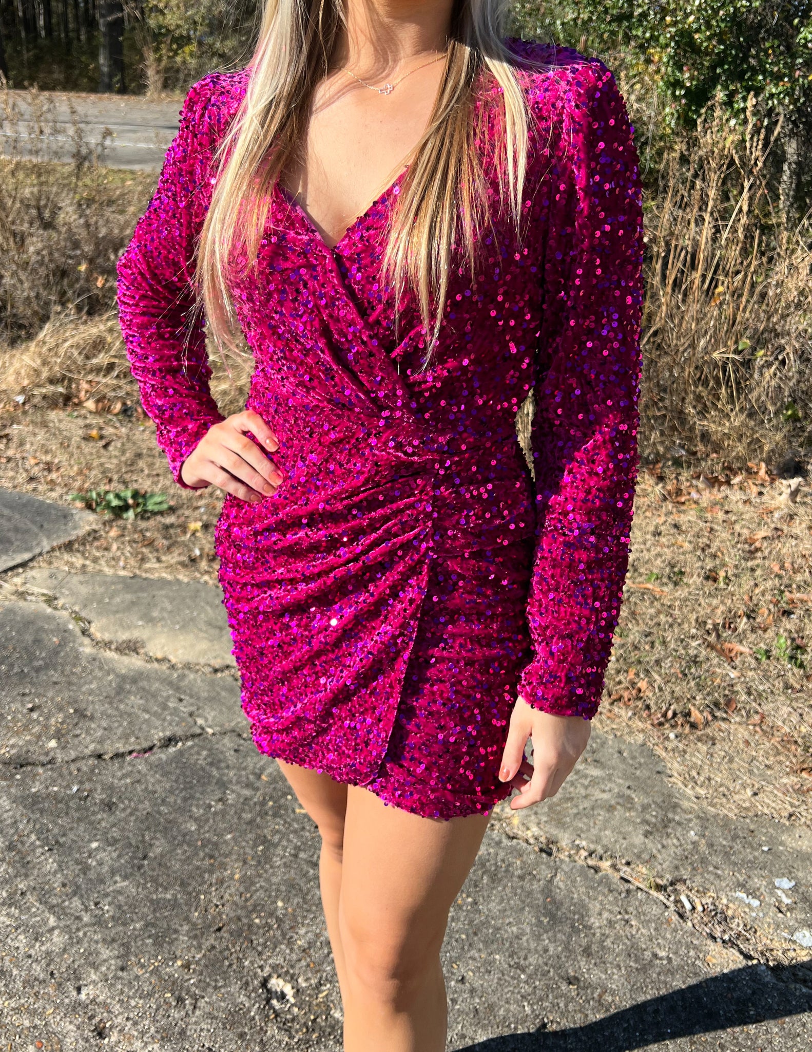 - Sequence Glitter Holiday Party Mini Dress - Side Zipper - Shirring Detail - Deep V-neck - Bright Colors - Sparkle Dress - Date Night Dress - Christmas Dress (Model height: 5'9", wearing a Small, 2-2-2- Size Ratio)