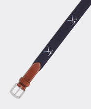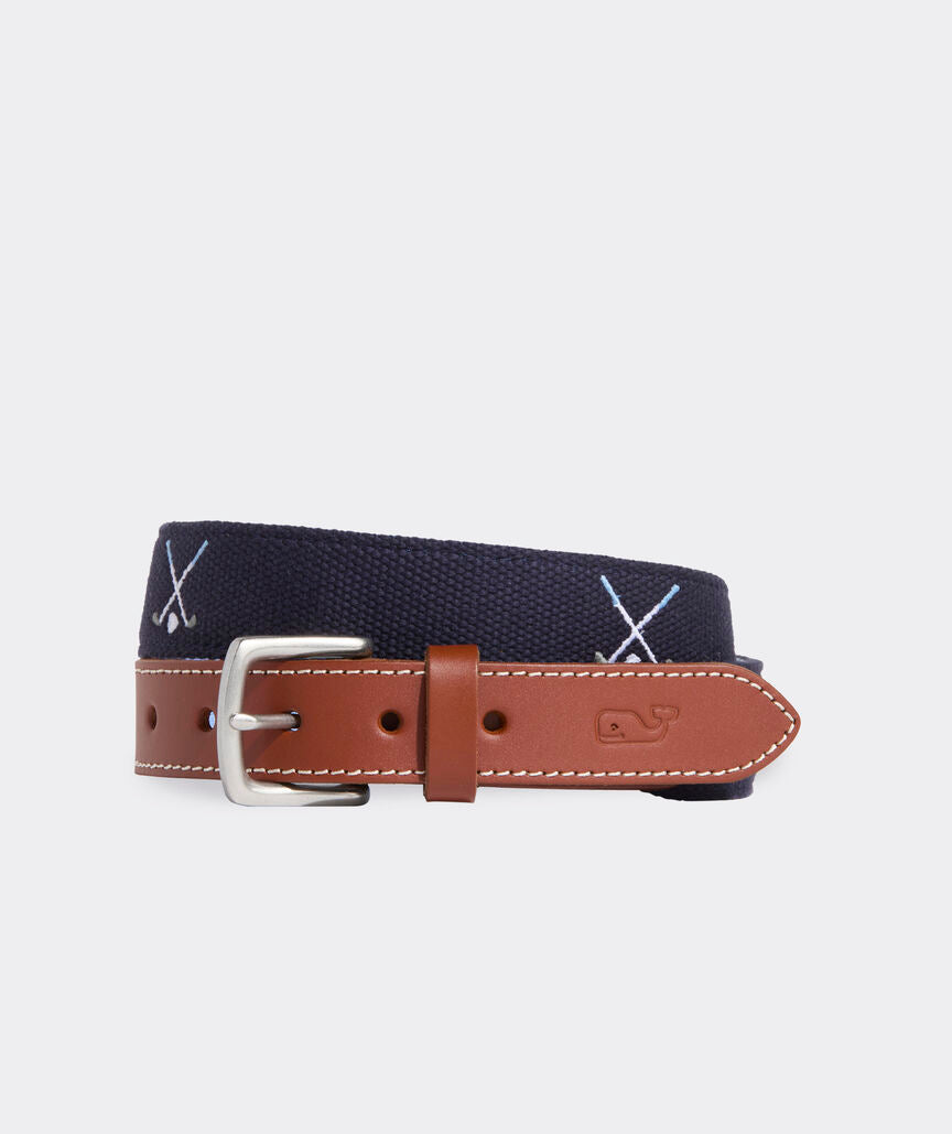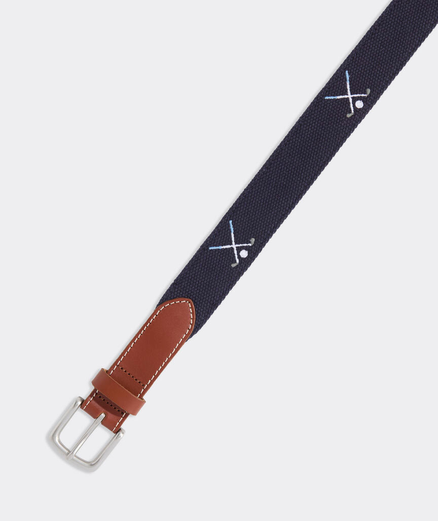 Hit the fairway with the Golf Clubs Embroidered Canvas Club Belt. Featuring detailed golf club embroidery on durable canvas webbing, it’s finished with Italian leather accents, light blue chambray backing, and pop top stitching for a refined look. The embossed whale at the tip adds a signature vineyard vines touch to this classic accessory.