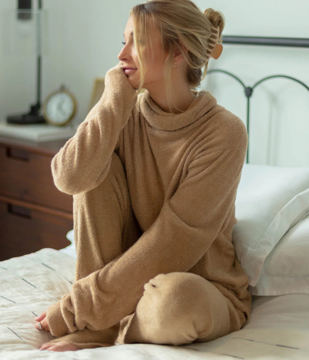 - Fuzzy and plush roll-neck sweater silhouette