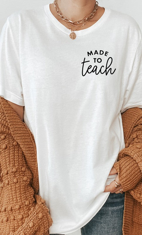 Made To Teach Graphic Pocket Tee. Most t-shirt colors are 52/48 cotton/polyester blend. Athletic Heather & Black Heather are 90/10 cotton/polyester. White, cream, citron, pink, canvas red, lilac, mint are 100% cotton. Ash is 99/1.