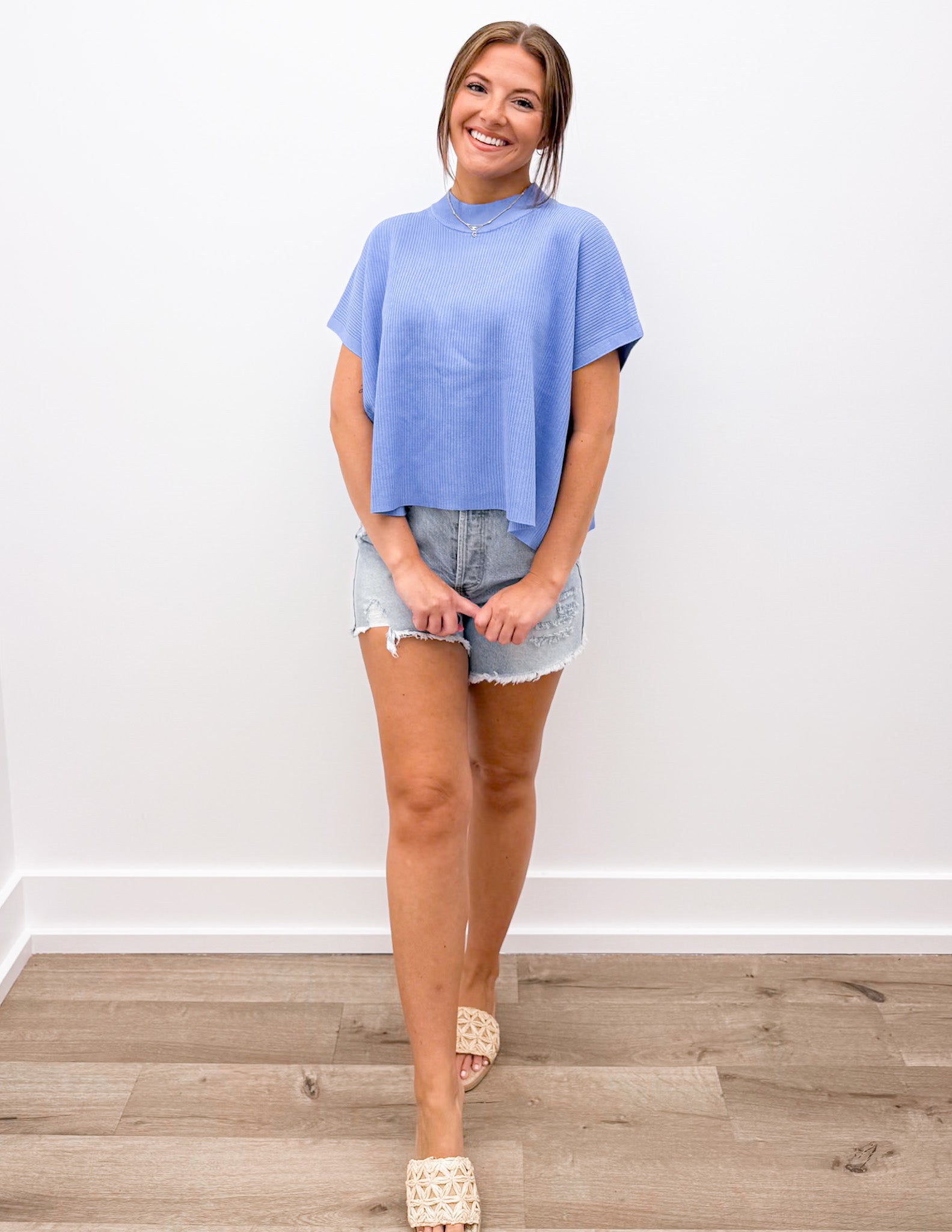 The Way I Feel Mock Neck SS Boxy Sweater Top in Cornflower Blue
